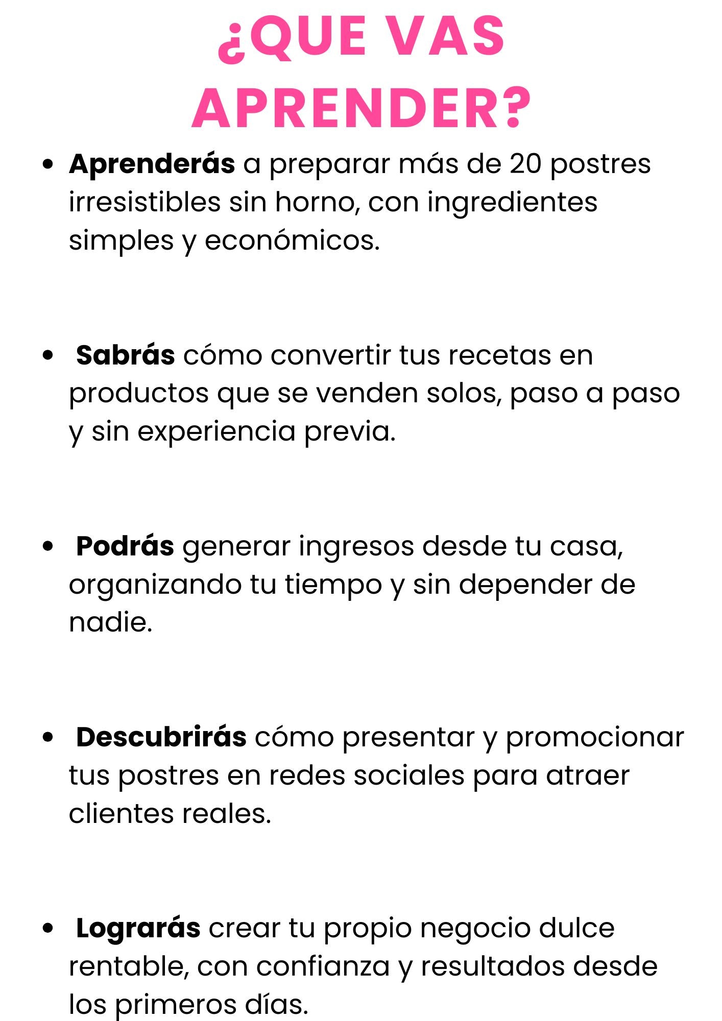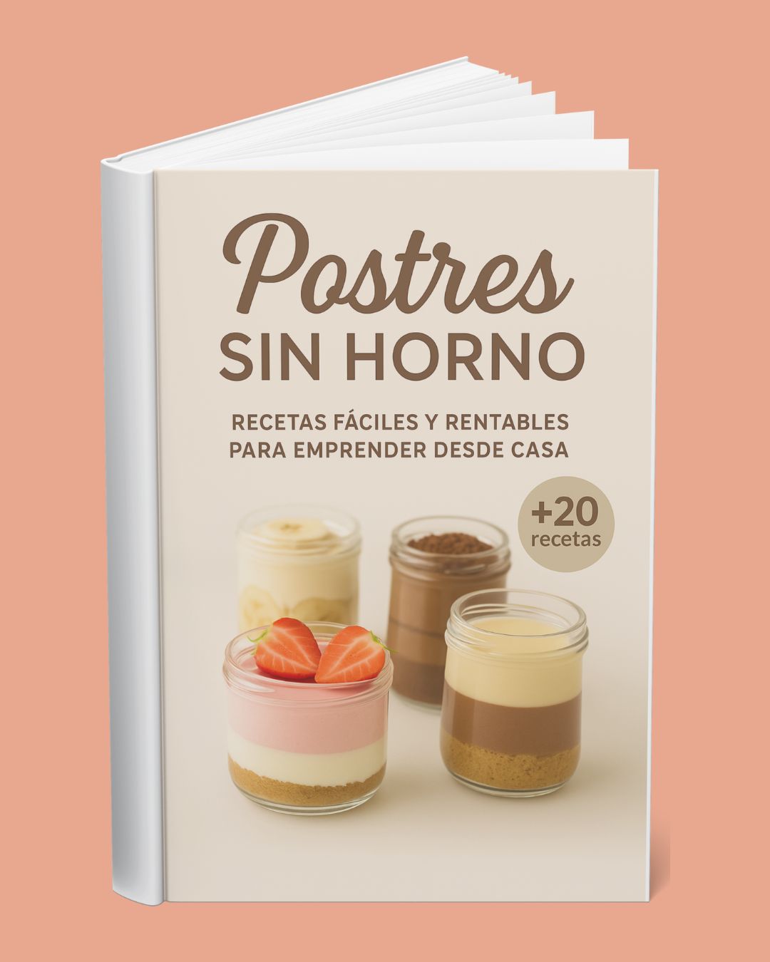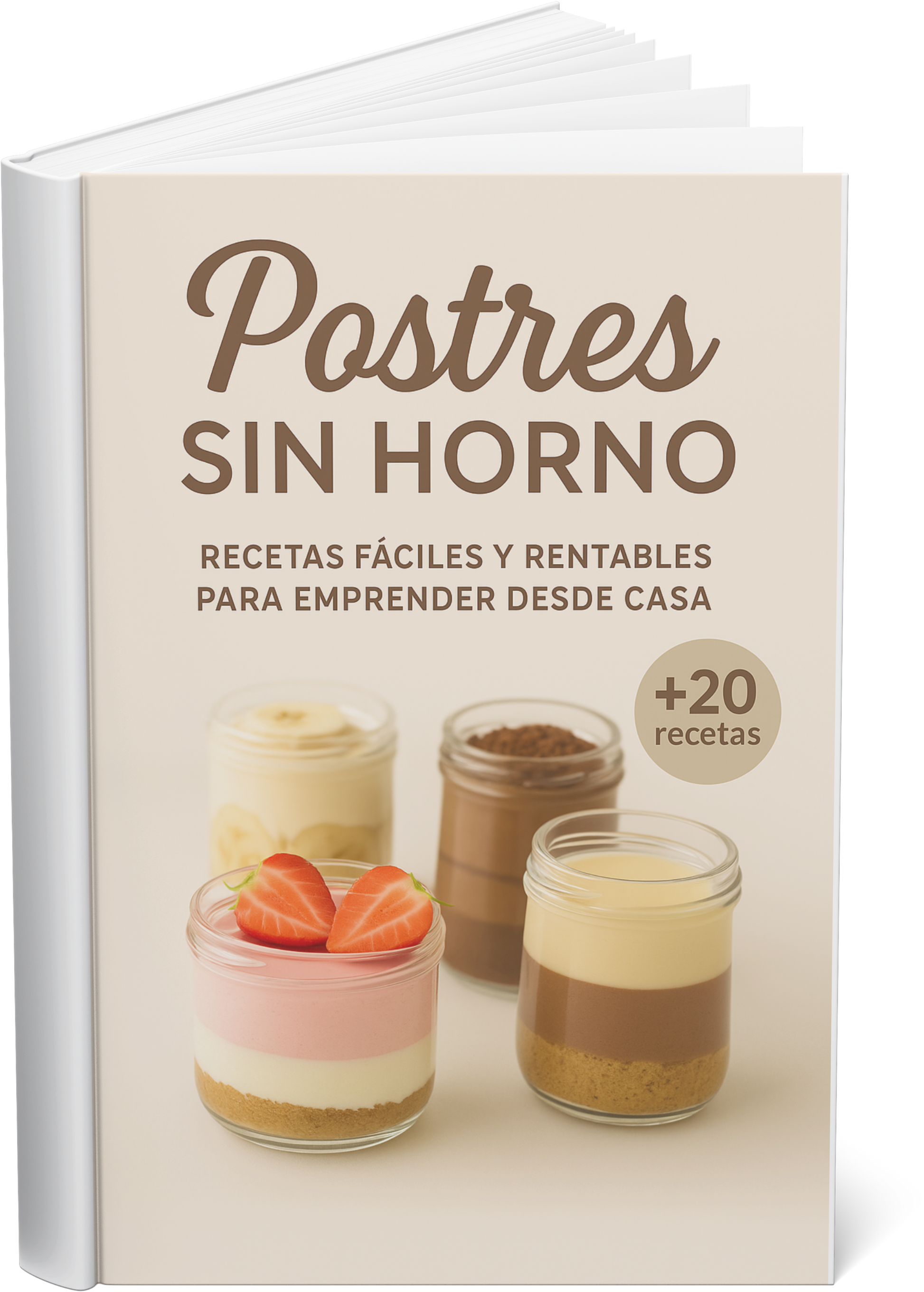 Además de las recetas, incluye estrategias de venta y tips de presentación, para que empieces a ganar dinero desde casa con postres que se venden solos.
