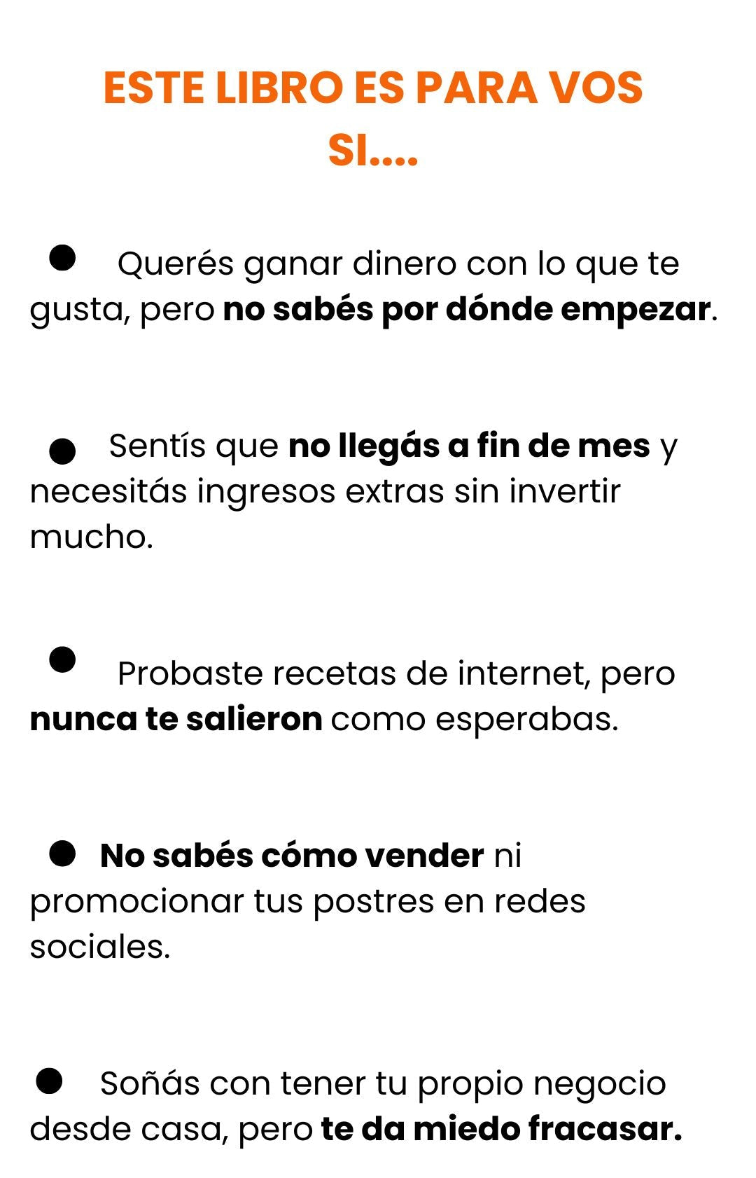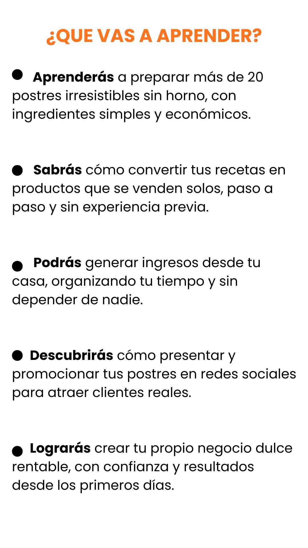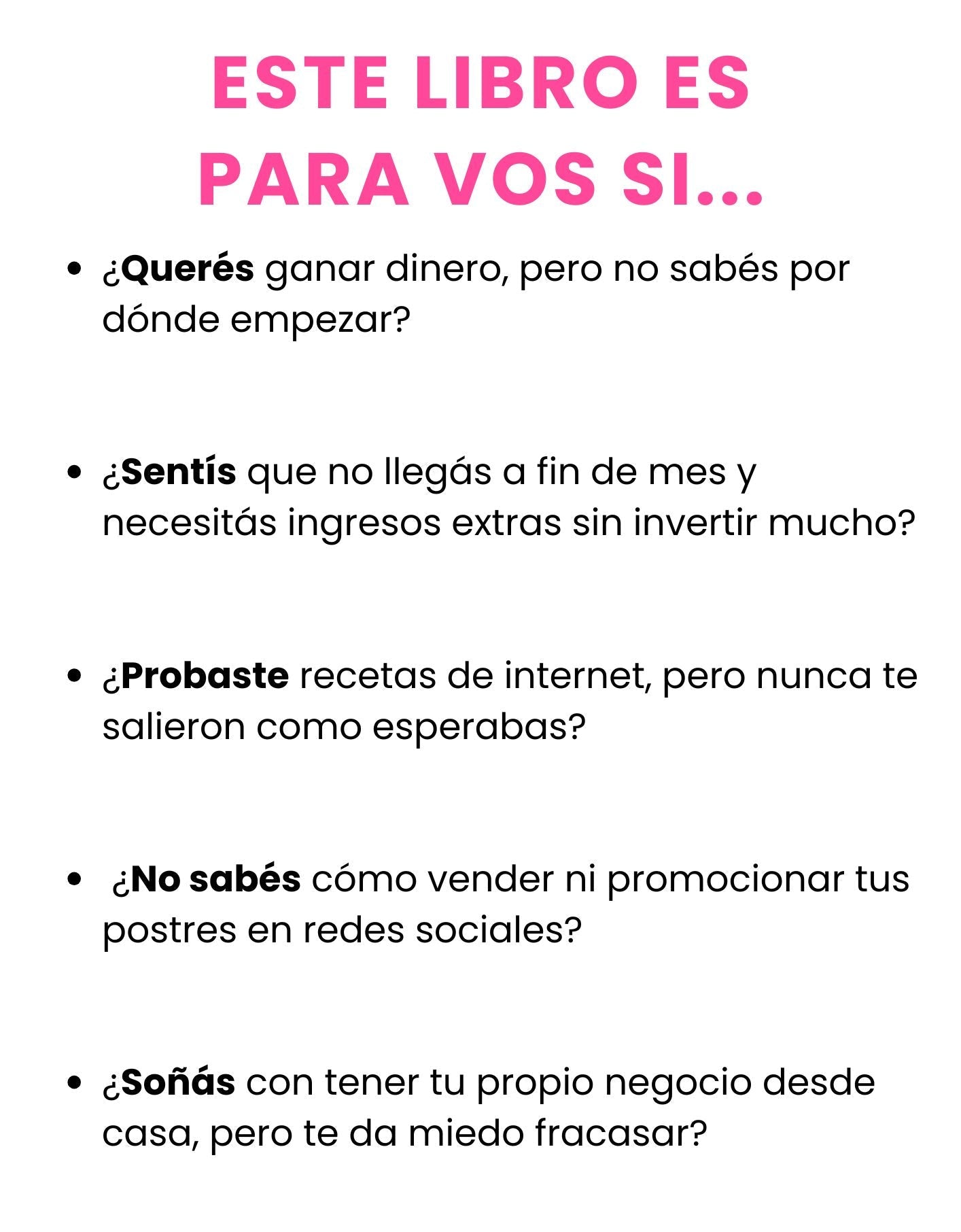 Además de las recetas, incluye estrategias de venta y tips de presentación, para que empieces a ganar dinero desde casa con postres que se venden solos.